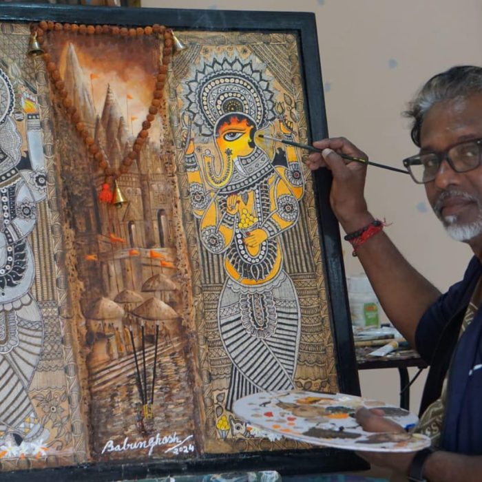 Babun Ghosh, a globally acclaimed fine artist and visualiser, expresses his artistic prowess through diverse mediums such as oil, watercolor, acrylic, pencil, and charcoal. Influenced by Bengal’s rich artistic heritage, his portfolio encompasses nature, landscapes, portraits, architecture, and tribal motifs like Madhubani and Gond art. Ghosh’s international recognition is evident through exhibitions held in prestigious galleries worldwide, including the esteemed Chitra Sante of Chitrakala Parishath in Bengaluru. In addition to showcasing his work in galleries, Ghosh is actively involved in mural projects for corporate clients.